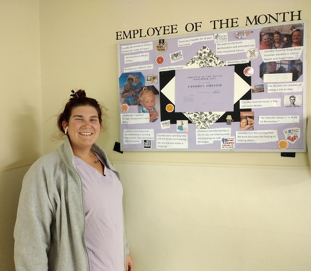 Venetian Gardens has an amazing team that is filled with individuals who are committed to making a difference in residents' lives. Our team goes above and beyond every day to care for each resident. Once a month, we recognize one of these incredible individuals as our Employee of the Month. This month, our Employee of the Month award goes to Cassidy Chesser, Nurse Aide!